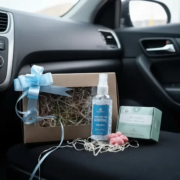 UN AROMATIZANTE PARA AUTOMÓVIL + JABONCITO+ CAJA DE PIEDRAS AROMÁTICAS + VIRUTA DE COLOR + MOÑO + TAG COLGANTE "FELICIDADES".
