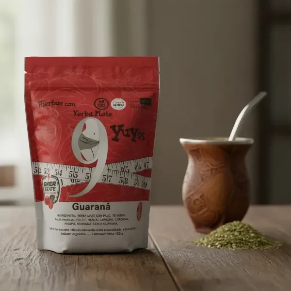 ****YERBA MATE 9 YUYOS GUARANÁ (DOYPACK) La yerba mate 9 yuyos, maravilla de la naturaleza, proviene de la zona serrana de Córdoba. Esta cuidadosamente elaborada con yerba mate y compuesta por hierbas naturales, las cuales cumplen distintas funciones. “Sentite bien, sentite liviano”. Descripción: Yerba mate 9 yuyos tradicional (envase de tela) Composición: Yerba mate con palo, carqueja, te verde, palo amarillo, poleo, menta, lapacho, carqueja, hisopo, guaraná, sabor guarana.